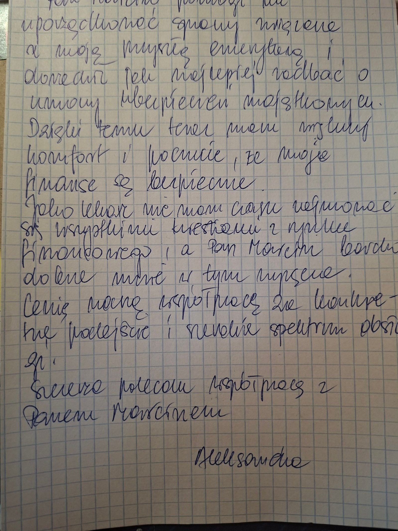 Trochę sceptycznie nastawiona do tego typu rozmów, zostałam bardzo mile zaskoczona! Okazało się, że trafiłam na przemiłą, kompetentną i bardzo zaangażowaną osobę. Pan Marcin spokojnie wysłuchał moich potrzeb i wątpliwości, a potem bez zbędnego pośpiechu wszystko sobie przemyślał i przedstawił mi optymalne rozwiązania. Już dziś, dzięki pomocy Pana Marcina, mam za sobą kilka ważnych kroków, które uporządkowały mój „chaos finansowy”. Zawsze uchwytny, pomocny. Cieszę się, że trafiłam na tak przemiłą i rzeczową Osobę. Mam nadzieję na dalszą owocną współpracę.