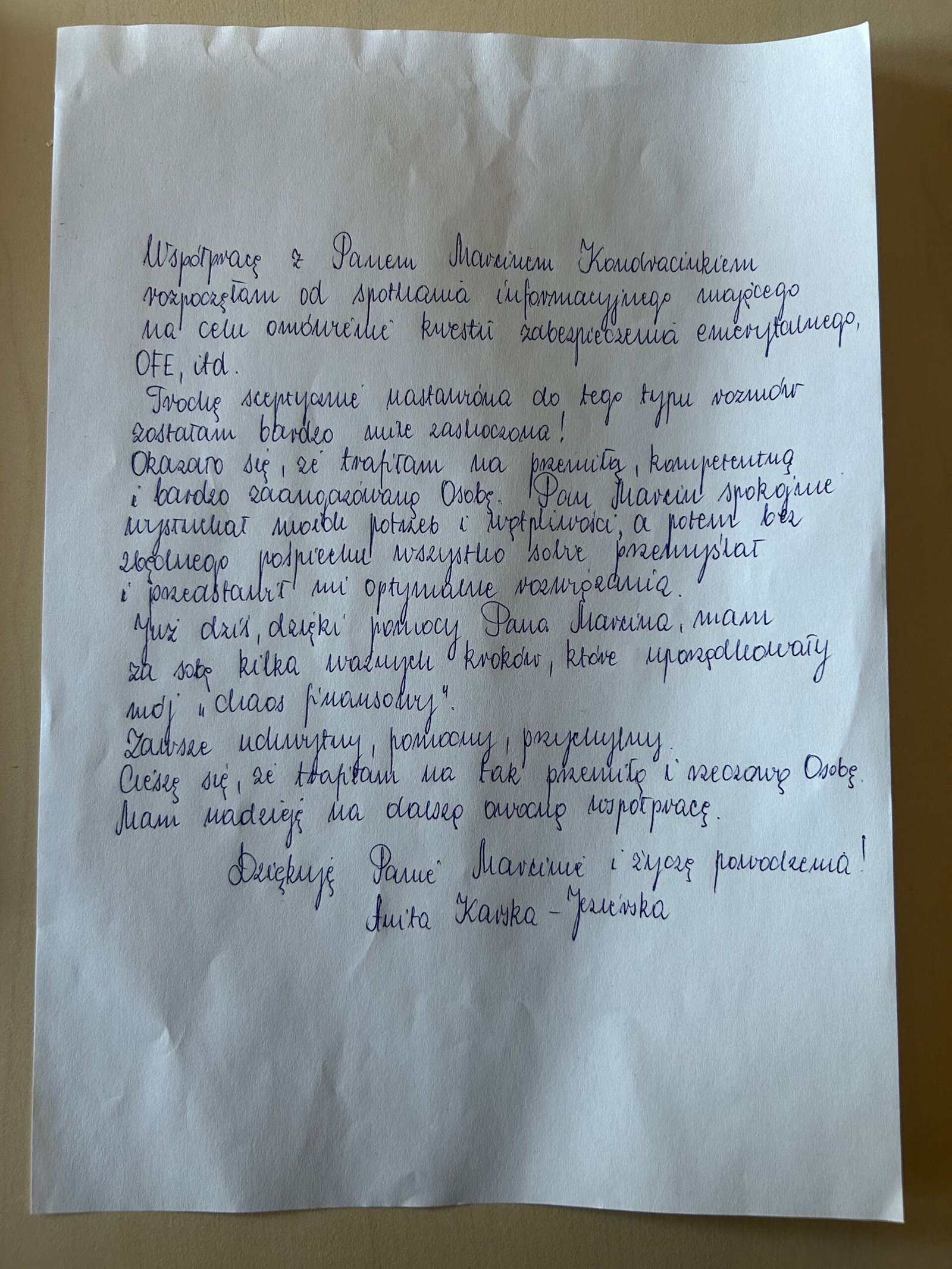 Współpracę z Panem Marcinem Kondraciukiem rozpoczęłam od spotkania informacyjnego mającego na celu omówienie kwestii zabezpieczenia emerytalnego, OFE, itd.