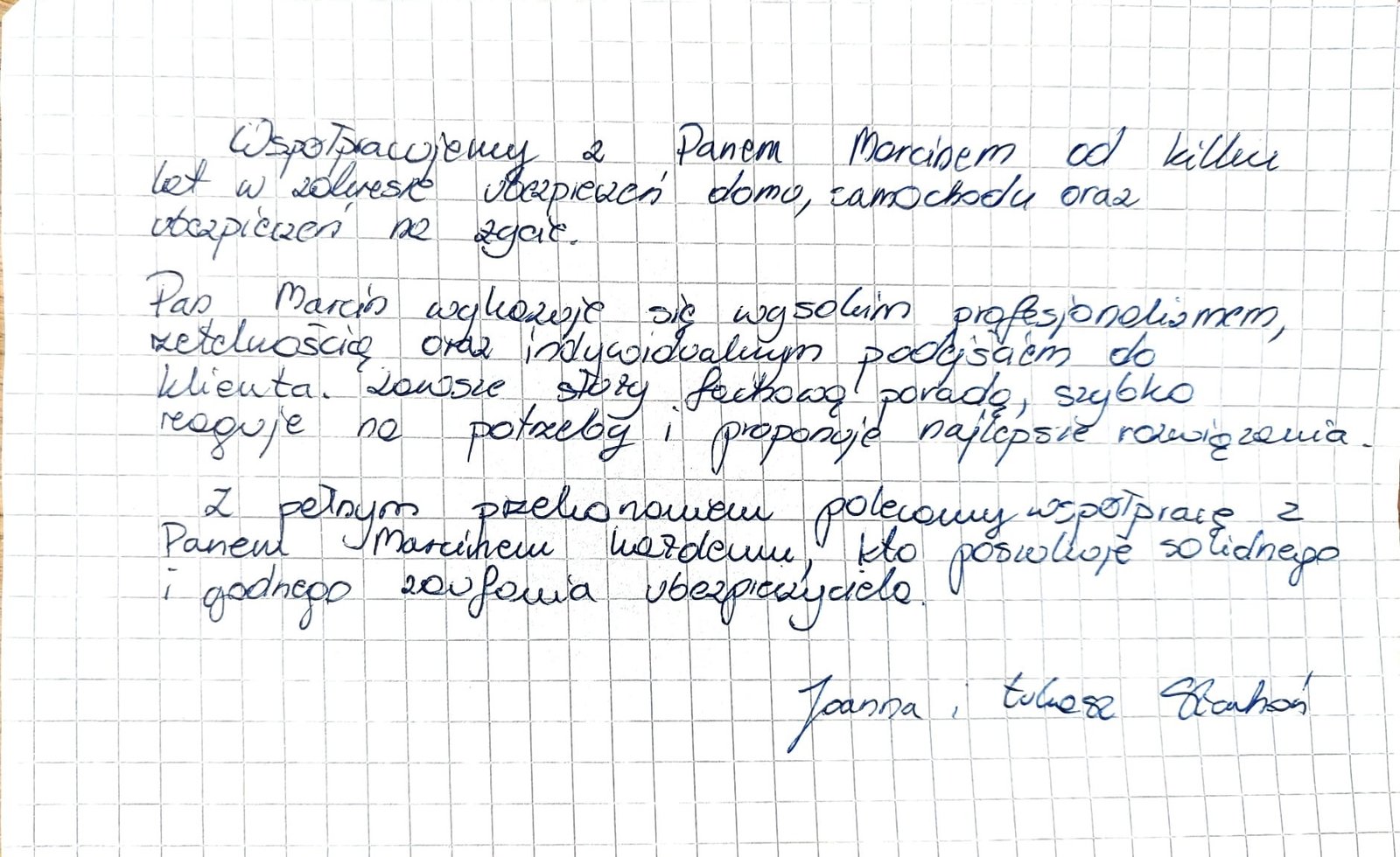 Z pełnym przekonaniem polecamy współpracę z Panem Marcinem każdemu, kto poszukuje solidnego i godnego zaufania ubezpieczyciela.